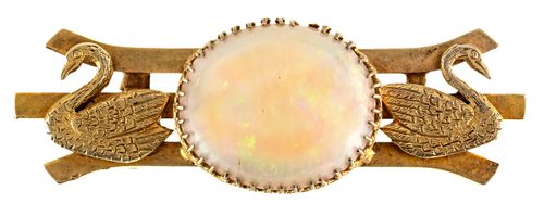 OPAL BROOCH, in gold plated sterling silver (tot wt 27.04g; 58.5x19.5mm), no maker, features three bars with an outward facing swan at each side and in the centre is an oval claw set white opal, pin-back, with unofficial box. Good very fine.