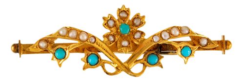 TURQUOISE AND PEARL BROOCH, in gold (15ct; 3.48g; 46x15mm), attributed to maker, Aronson & Co, features a bar with floral decoration all fitted with natural turquoises (5) and seed pearls (16), pin-back. Nearly uncirculated.