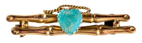 IMITATION TURQUOISE BROOCH, in gold (9ct; 3.72g; 44x11mm), by (A.) Macrow & Sons, features a stylized double bar with a heart shaped claw set imitation turquoise in the centre and with a gold rope behind it, pin-back. Toned good very fine.