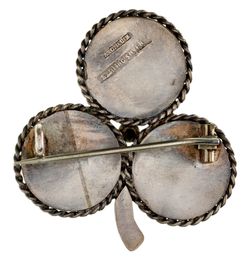 QUANDONG SEED BROOCH, in sterling silver frame (tot wt 9.69g; 43x46mm), by A.C. Due, features a three leaf clover with each leaf fitted with a quandong seed, pin-back, with unofficial box. Toned very fine.