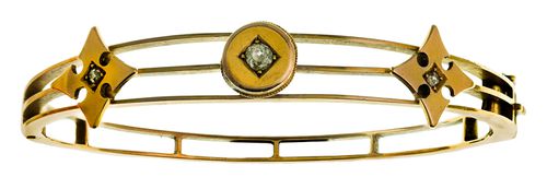 BRACELET, in gold (15ct; 14.80g; 63.5x60mm), by G.B&S (G.Bradley & Son), features a double bar at the base and triple bar at the top decorated with a round fitting inset with a diamond and two stylized crosses both inset with diamonds, push clip opening with safety chain, with different jeweller's felt bag and box. Very fine.
