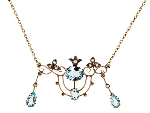 AQUAMARINE NECKLACE, in gold (9ct; 5.59; length when worn approx 34cm), attributed to (Joseph) Lawrence, features a thin chain and at the end is a display of four aquamarines and nine seed pearls, with unofficial box. Toned very fine.