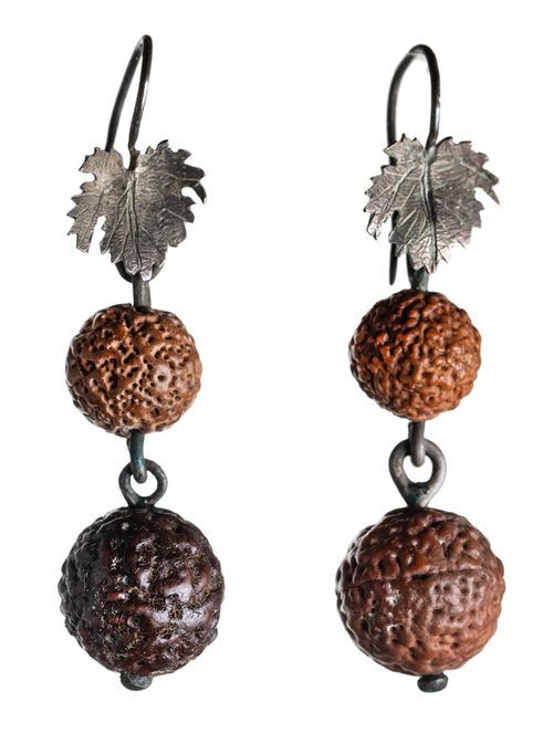 QUANDONG SEED EARRINGS, (13x41mm), features two seeds connected by a suspension loop and with small silver leaf supports and wires for pierced ears, maker unknown. Toned very fine. (Pair)