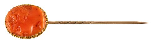 CAMEO STICK PIN, in gold frame (9ct; tot wt 2.88g; cameo 14x18mm, pin 58mm, not ...