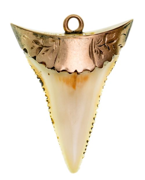 SHARK'S TOOTH PENDANT, with gold fitting (9ct; tot wt 2.33g; 21x27mm), features a shark's tooth with an engraved decorated suspension frame at the top, ring top suspension, attributed to R.H. Parker, with unofficial box. Very fine.