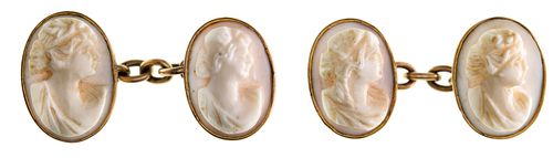 SHELL CAMEO CUFFLINKS, in gold settings (9ct; tot wt 9.74g), by Wendt, features carved head and shoulders of a lady facing sideways on all links. Good very fine.