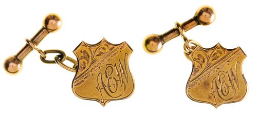 CUFFLINKS, in gold (9ct; 6.45g; 15x19mm), by D.H.McDougall, features a shield with some engraved decoration ...