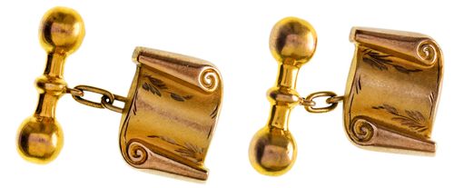 CUFFLINKS, in gold (9ct; 5.14g; 18x14mm), by Wendts, features open scroll type links with chain ...