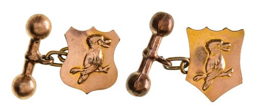 CUFFLINKS, in gold (9ct; 4.45g; 14.5x17mm), by Ront, features a shield with a sitting kookaburra. ...