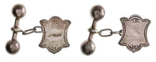 CUFFLINKS, in silver (5.09g; 15x18mm), maker unknown, features a shield with engraved decoration around edge ...