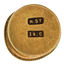 SHELL CAT'S EYE COLLAR STUD, in gold (18ct; 3.24g; 12.5x14mm), by H.St (H.Steiner), features a shell cat's eye stud mounted on a gold frame. Very fine.