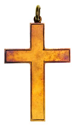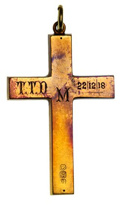 CROSS PENDANT, in gold (15ct; 2.38g; 25x37mm), attributed to Willis & Sons, features a plain hollow cross and on the reverse cross arms it is inscribed, "T.T.D M 22/12/18", ring top suspension. Toned very fine.