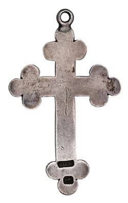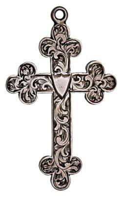 CROSS, in sterling silver (4.09g; 26x40mm), by (J.M.) Wendt, features a hand engraved cross with a shield engraved in the cross arms, reverse is plain, with ring top suspension. Toned fine.
