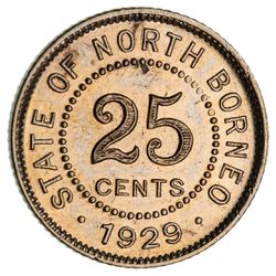 BRITISH NORTH BORNEO, George V, silver 25 cents, 1929 H (KM.6). Extremely fine.