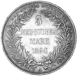 GERMAN NEW GUINEA, five marks, 1894A. Subdued mint bloom with greenish blue grey toning, almost mark-free and virtually uncirculated, rare thus and one of the finest known. Ex. Noble Numistmatics Sale 45A (lot 717).