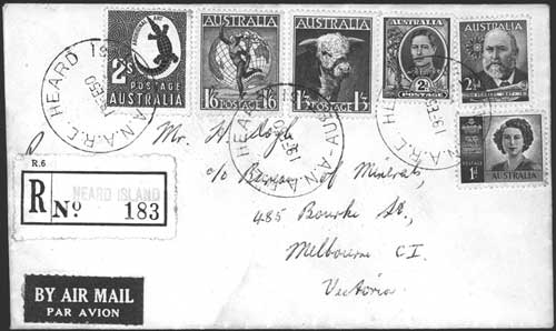 HEARD ISLAND TO MELBOURNE, Registered cover bearing 2/- Aboriginal Art, 1/6 Hermes, 1/3 Bull, 2 1/2d Forrest, 2d KGVI, 1d Princess Elizabeth (total 5/2 1/2d), stamps cancelledwith three strikes of A.N.A.R.E. HEARD Is CDS 19FE50, AIRMAIL sticker on front, backstamped REGISTERED MELBOURNE CDS 18MR50. Registration label toned, hinges on back. Otherwise clean. (1)