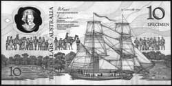 TEN DOLLARS, Johnston/Fraser (1988) specimen polymer note in Reserve Bank folder, dated 26 January 1988, overprinted 'SPECIMEN' in red on right side on front of note, and 'SPECIMEN / No.0067' on right side on back of note, serial number AA00 000000. This folder has been signed by the note's designer Harry Williamson 'For Norm, with thanks also for your support with the $100'.