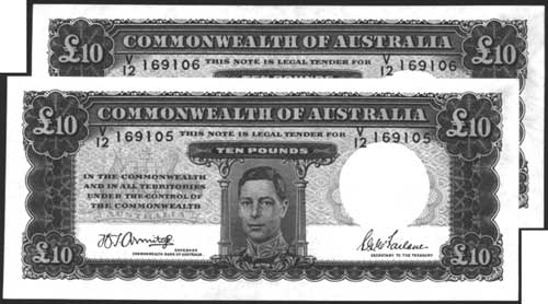 TEN POUNDS, Armitage/McFarlane (1943) V/12 169105-6 (R.59) consecutive pair. Nearly uncirculated and rare thus. (2)