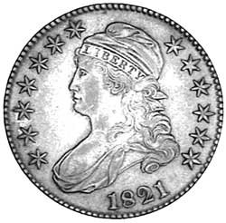 U.S.A., silver half dollar, 1821, Liberty Cap type, Overton 106. Blue and gold toning over ...