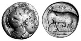 ITALY, Lucanaia, Thurium (Thourioi), (c.400-350 B.C.), silver stater, (7.50 grams), obv. crested helmeted head of Athena to right ornamented with figure of Scylla, rev. bull ...