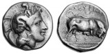 ITALY, Lucania, Thurium (Thourioi), (350 -300 B.C.), silver stater, (7.82 grams), obv. head of Athena to right wearing crested Athenian helmet, ornamented with figure of ...