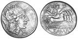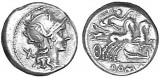C. ABURIUS GEMINUS, (134 B.C.), silver denarius, Rome mint, (3.832 grams), obv. Roma helmeted head right, * under chin, GEM behind, rev. Mars in quadriga ...