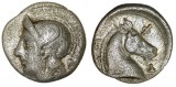 THESSALY, Pharsalos, (424-405/4 B.C.), silver hemidrachm, (2.70 grams), obv. head of Athena to left with close fitting crested helmet, A behind, rev. Horse's head to ...
