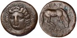 THESSALY, Larissa, (350-325BC), copper drachm, (4.172 grams), obv. head of nymph Larissa three-quarter face to left, wearing necklace, hair floating loosely with ampyx in front, ...