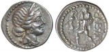 C. PISO L.F. Frugi, (c.67 B.C.), silver denarius, Rome mint, (3.81 grams), obv. Apollo head to right with fillet, flower behind, rev. C. PISO L.F. ...