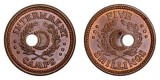 COMMONWEALTH OF AUSTRALIA, World War II, Internment Camps five shillings. Central hole punched off centre, traces of red, uncirculated and very rare as such.