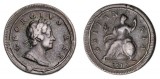 GEORGE I, halfpenny, 1717, "dump" first issue, struck on a broad flan of the second issue (S.3659). Pitted surface, dark brown patina, possibly unique.