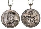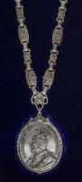 GEORGE V MEDAL FOR NATIVE CHIEFS, 1920, in silver oval (67mm x 50mm) suspended on 78cm silver chain with links bearing Tudor rose, GRI, and ...