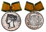 SIERRA LEONE, Queen Victoria, Chief's Medal, c1870 in silver (72mm, 5mm thick; 156g) holed for suspension with jump ring and length of yellow ribbon with ...