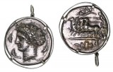 A SYRACUSE DECADRACHM BY KIMON, set in a claw ring mount (41.81g), a quality cast gifted by Bill Bush (USA), a significant donor of banknotes ...