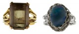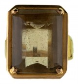 LADY'S DRESS RINGS, smokey quartz trap cut gem (approx 3g), four claw bezel set, wire shoulders, double shank with four wires between, hallmarked 18ct; costume ...