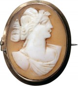 CAMEO BROOCH, vintage carved shell design in a plain oval gold frame (9ct; tot wt 3.96g; 26x32mm), pin-back. Very fine.