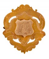VOLUNTARY AID DETACHMENT, brooch in voided gold (15ct; 5.03g; 27x32mm), by (David L.) Lyall, features shield in centre of obverse inscribed, "AA", reverse inscribed, "V.A.D.", ...