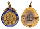 TRIBUTE FOB, 1916, Millicent Honors Her Soldiers, in gilt and enamel (25mm), reverse inscribed, "Pte A.R.Bellinger.", ring top suspension. Good very fine.