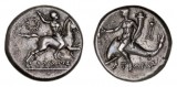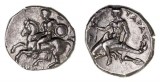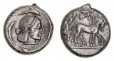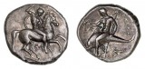 CALABRIA, Tarentum, (c. 272-240 BC) silver nomos (6.59 g), obv. nude youth riding horse walking to left, raising his right hand to crown the horse's ...
