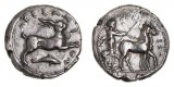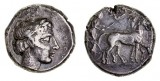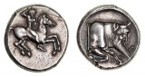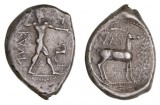 ITALY, Bruttium, Kaulonia, silver stater, 460-450 B.C. (Kraay chronology), (7.02 g), obv. Apollo naked walking to right, before him a small stag standing to right, ...