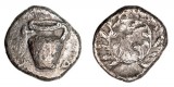 CALABRIA, Tarentum, (c.450-380 B.C.), silver hemiobol (7.5mm, 0.28 g), obv. skyphos with handle to right, rev. wreath, S.-, Vlasto 1747, cf.HN Italy 867/866). Toned, areas ...
