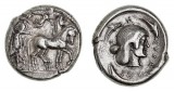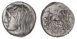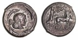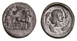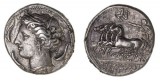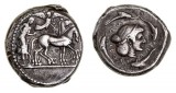 SICULO-PUNIC, "Camp of Melkart", (c.330-305 B.C.), silver tetradrachm, (17.24 g), obv. charioteer driving a quadriga of rearing horses to right, holding kentron in right hand, ...