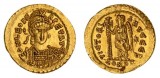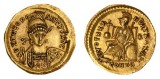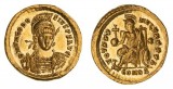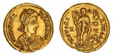 HONORIUS, (A.D. 393-423), gold solidus, Ravenna Mint, issued A.D. 402-406 (4.47 g), obv. pearl diademed bust draped and cuirassed of Honorius to right, around D ...