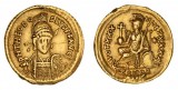 THEODOSIUS II, (408-450 AD), gold solidus, (4.44 g), Constantinople Mint, obv. pearl diademed, helmeted, and cuirassed bust facing, holding spear and shield, rev. Constantinopolis seated ...