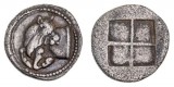 MACEDON, Akanthos, silver tetrobol, (470-390 B.C.), (2.28 g), obv. forepart of bull kneeling left, looking back, above **P* and swastika, dotted border, rev. shallow quadripartite ...