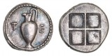 MACEDON, Terone, (424-422 B.C.), silver tetrobol or sixth stater, (2.41 g), obv. oinochoe to left, T E to sides, in dotted circle, rev. quadripartite incuse ...