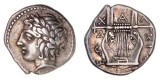 MACEDON, Chalkidian League, (c.383/2 B,C.), silver tetrobol (2.35 g), Olynthos Mint, obv. laureate head of Apollo to left, dotted border, rev. kithara within incuse square, ...