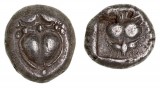 KYRENAICA, Kyrene, (c.520-489 B.C.), silver drachm, (3.85 g, Attic standard), obv. two heart-shaped silphium fruits (seed pods?) facing each other (one off flan), two dots ...