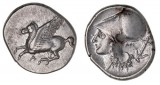 CORINTHIA, Corinth, (c.375-300 BC), silver stater (8.55g), obv. Pegasos flying left, Q below, rev. head of Athena left, wearing a laureate Corinthian helmet, boar standing ...