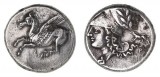 PELOPONNESOS, Corinthia, Corinth, (400-375 B.C.), silver stater, (8.54 g), obv. Pegasos flying to right with pointed wing, Q below, rev. head of Athena or Aphrodite ...